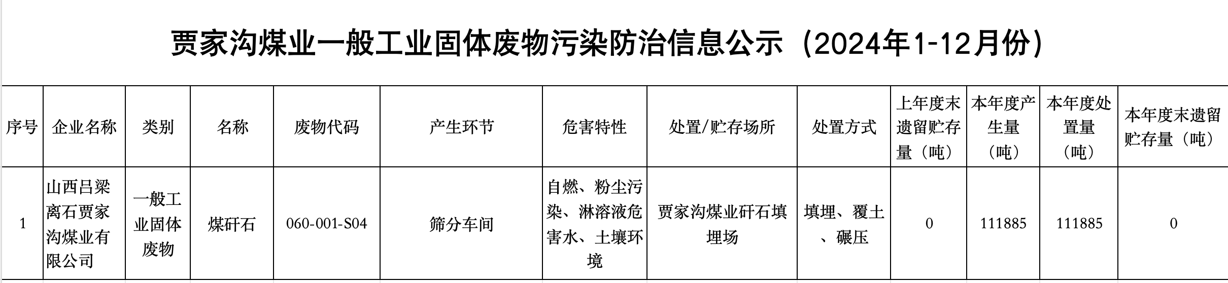 贾家沟煤业一般工业固体废物污染防治信息公示(2024年1-12月份)