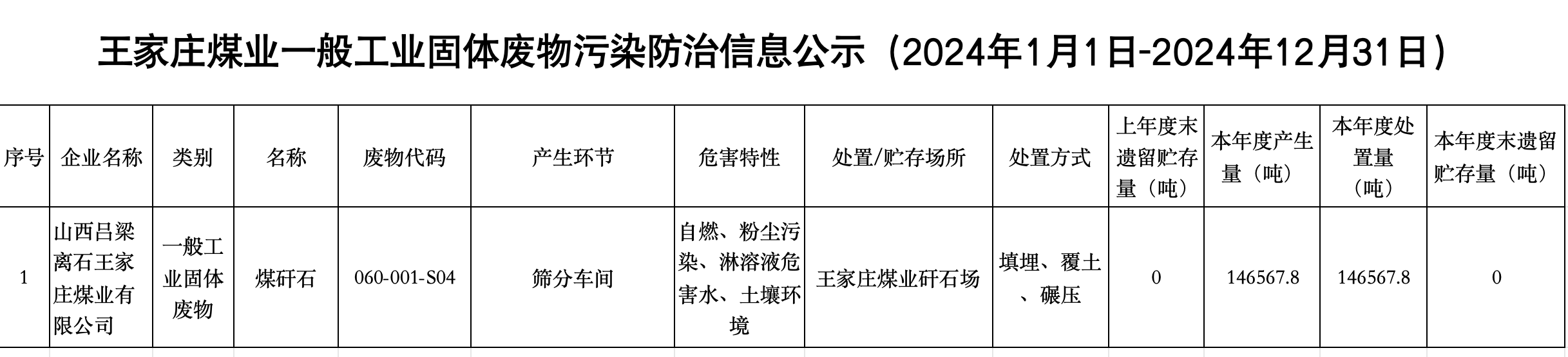 王家庄煤业一般工业固体废物污染防治信息公示(2024年1月1日-2024年12月31日)
